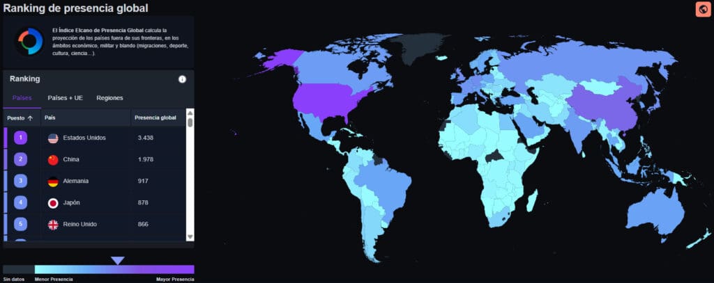 El Índice Elcano de Presencia Global, elaborado por el Real Instituto Elcano, revela que, pese a los esfuerzos de China por ampliar su proyección internacional, EE.UU. sigue superando a Pekín en este ámbito. El índice en cuestión mide el grado de proyección internacional de los países en tres dimensiones: económica, militar y de poder blando, esta última incluyendo aspectos como migraciones, deporte, cultura y ciencia. Además de los países mencionados, Alemania, Japón, y Reino Unido completan el top 5 del ranking.