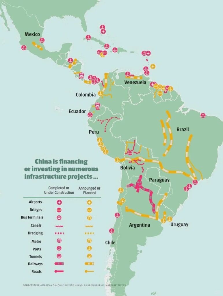 La proyección de China en América Latina se consolida mediante la proliferación de proyectos de inversión en infraestructuras críticas en toda la región. Desde aeropuertos hasta puertos marítimos, túneles, ferrocarriles y carreteras, la expansión del capital chino abarca territorios estratégicos que inician en México y terminan en el Cono Sur.