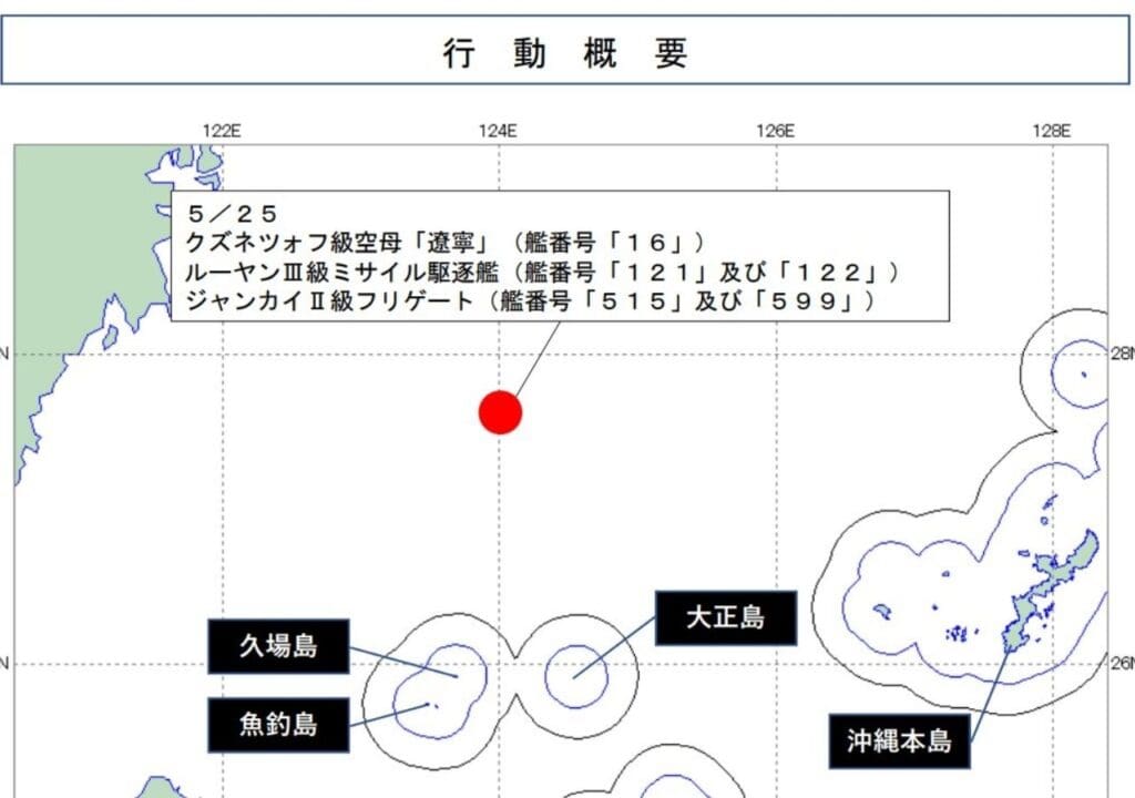 El Ministerio de Defensa japonés informó que, el domingo 25 de mayo, cinco buques de guerra chinos —incluido el portaaviones Liaoning, dos destructores de misiles guiados clase Luyang III y dos fragatas clase Jiangkai II— realizaron ejercicios navales al norte de la isla de Kuba, en la prefectura de Okinawa. Durante las maniobras, se observó el despliegue de cazas y helicópteros desde la cubierta del Liaoning, lo que motivó el despegue inmediato de cazas de la Fuerza Aérea de Autodefensa japonesa (ASDF).