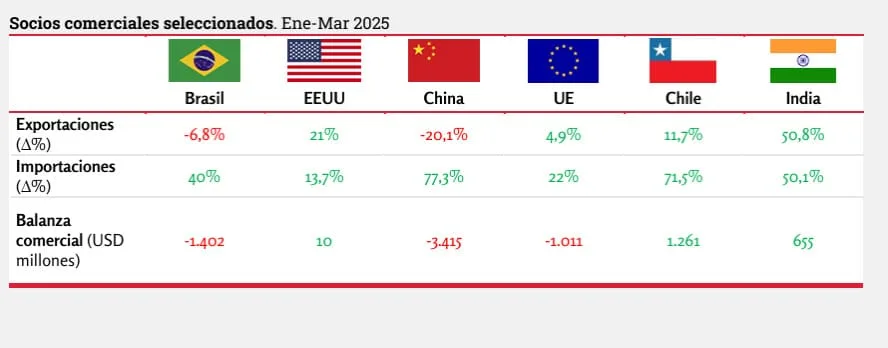 Los principales productos exportados por Argentina siguen siendo agrícolas e industriales: harina y pellets de soja (USD 678 millones), maíz (USD 638 millones), aceite de soja (USD 468 millones) y petróleo crudo (USD 455 millones). En cambio, entre los productos importados lideran la lista los porotos de soja (USD 251 millones), vehículos para transporte de personas (USD 270 millones entre dos categorías) y gasóleo (USD 119 millones), lo que revela una dependencia crítica de insumos energéticos y bienes durables.