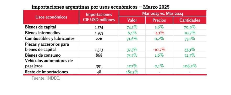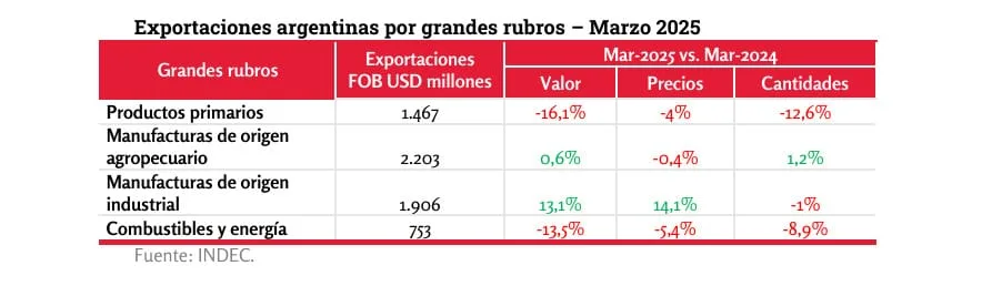 En este sentido, los datos revelaron que el primer trimestre de 2025 cerró con un superávit acumulado de apenas USD 761 millones, cifra que contrasta fuertemente con los USD 4.401 millones del mismo período en 2024. La causa principal fue el notable incremento de las importaciones (+35%), en comparación con un modesto crecimiento de las exportaciones (+5,3%). En marzo, las ventas externas cayeron 2,5% interanual, principalmente por una baja del 4,2% en las cantidades exportadas, pese a una leve mejora de los precios (+1,8%).