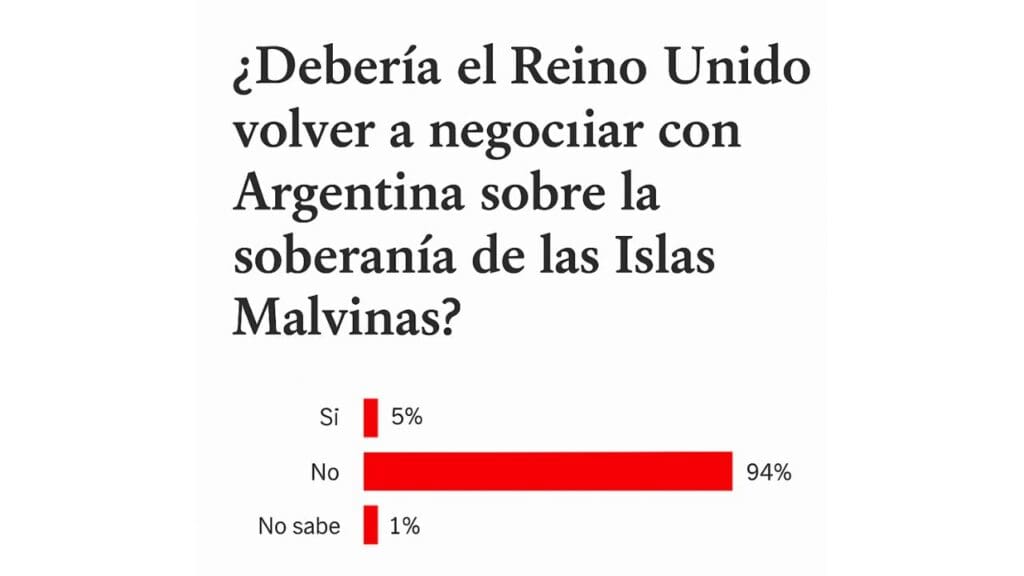 El reciente acuerdo entre Reino Unido y Mauricio por el archipiélago de Chagos abrió la discusión sobre la posible negociación por las Islas Malvinas, un medio británico lanzó una encuesta a sus lectores con una pregunta directa y políticamente sensible: “¿Debería el Reino Unido reabrir negociaciones con Argentina sobre la soberanía de las Islas Malvinas?” Los resultados fueron contundentes: el 94% respondió negativamente, solo un 5% apoyó la idea, y apenas un 1% se mostró indeciso.