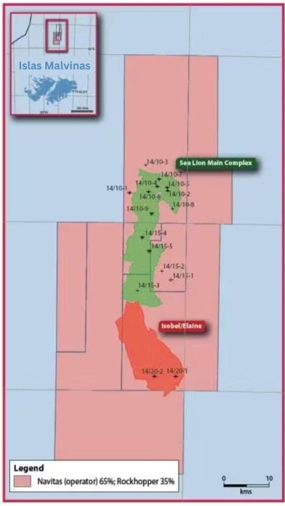 El proyecto Sea Lion (León Marino), liderado por la empresa israelí Navitas Petroleum en asociación con la británica Rockhopper Exploration, está ubicado a unos 220 kilómetros al norte del archipiélago en el Bloque 14/10, dentro de las licencias ilegítimas de producción PL032 y PL004b. Inicialmente, el socio era Harbour Energy, compañía que decidió abandonar el proyecto en septiembre de 2021, y luego Rockhopper, Harbour y Navitas firmaron en diciembre de 2021 para permitir una salida limpia de Sea Lion.