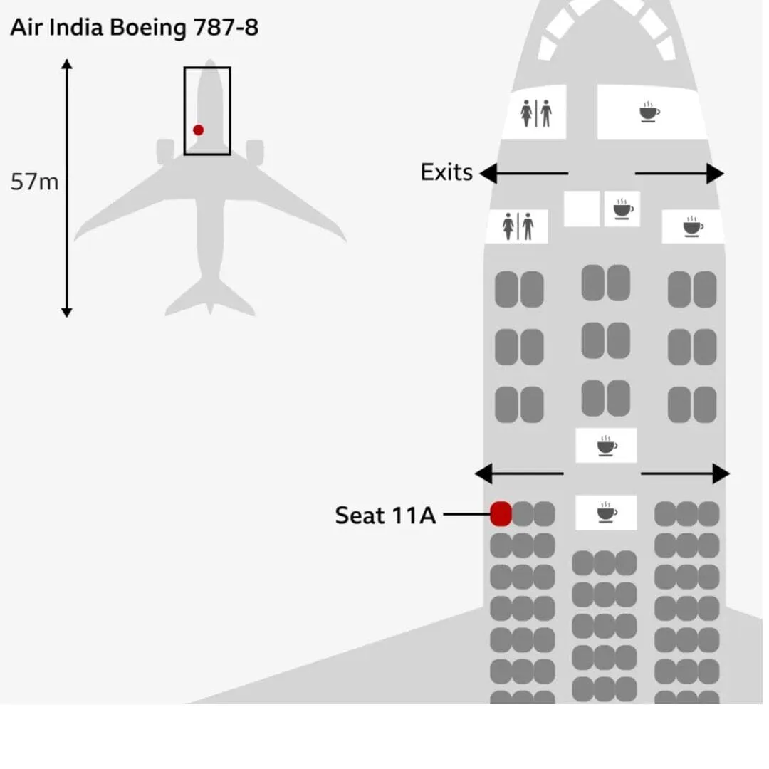 Un accidente de la aerolínea Air India, en el que murieron al menos 200 personas, dejó un sobreviviente: Vishwashkumar Ramesh, que ocupaba el asiento 11A. El avión Boeing 787-8, con destino a Londres, se estrelló contra un alojamiento utilizado por médicos menos de un minuto después de despegar.