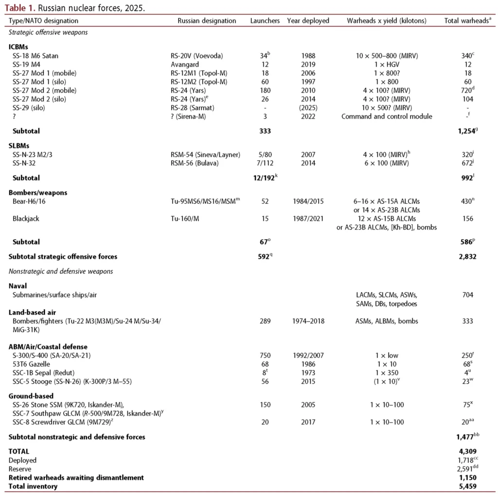 A comienzos de este 2025, se estima que el arsenal nuclear ruso incluye unas 4.309 ojivas designadas para lanzadores estratégicos de largo alcance y para fuerzas nucleares tácticas de corto alcance. Esta cifra representa una disminución de aproximadamente 71 ojivas respecto del año anterior, debido principalmente a un ajuste en la estimación de las armas asignadas a fuerzas no estratégicas. De ese total, alrededor de 1.718 ojivas estratégicas estarían desplegadas: unas 870 en misiles balísticos terrestres, cerca de 640 en misiles lanzados desde submarinos, y más de 200 posiblemente ubicadas en bases con bombarderos pesados. A esto se suman unas 1.114 ojivas estratégicas almacenadas y unas 1.477 no estratégicas. Además, existen unas 1.150 ojivas retiradas que aún no han sido desmanteladas, lo que eleva el total a cerca de 5.459 ojivas.