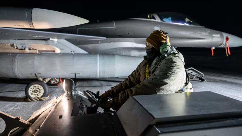 Un aviador carga munición en un avión estadounidense durante la operación “Noble Defender” en la base espacial de Pittufik, Groenlandia, el 5 de febrero. Créditos: Sargento Técnico Christopher Ruano/Fuerza Aérea Estadounidense