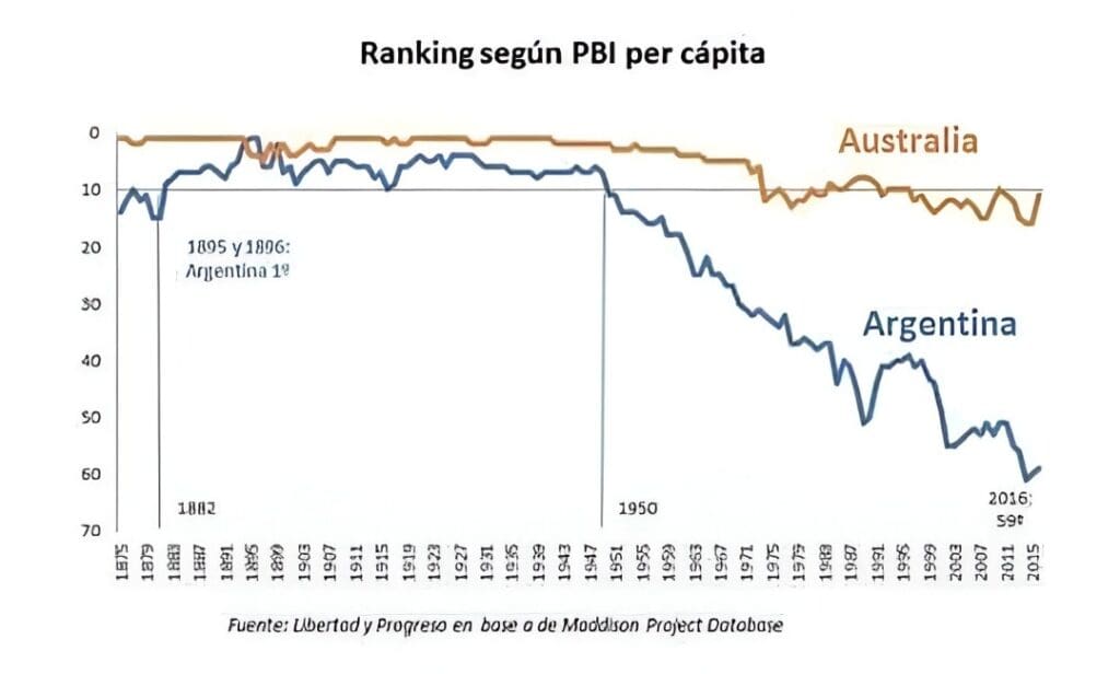 El resultado de esta visión hacia adentro fue una larga decadencia económica: hasta entrados los años 60 Argentina aún tenía un ingreso per cápita superior al de Italia o Japón, pero luego quedó rezagada.