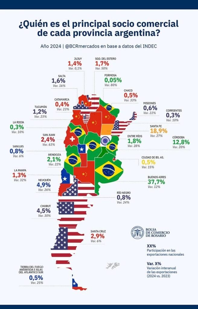 De hecho, más de la mitad de las exportaciones argentinas (64% en 2025) provienen de la agroindustria, rubro en el que el país es líder mundial en productividad en algunas cadenas (soja, biodiesel, vinos, etc.).