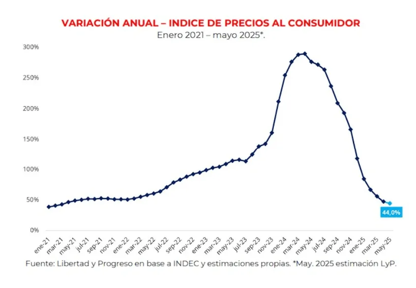 Afortunadamente, hay motivos para la esperanza en el frente macroeconómico, donde tras años de descontrol, en 2024 Argentina logró una notable desaceleración inflacionaria. El cambio de rumbo económico a fines de 2023, que conllevó un fuerte ajuste fiscal y monetario, logró bajar la inflación anual desde el 211% en 2023 a 43,8% en mayo de 2025, una reducción de casi 170 puntos.