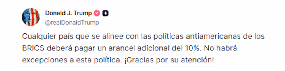 El presidente de Estados Unidos, Donald Trump, anunció que impondrá un arancel adicional del 10% a todas las naciones que adopten políticas alineadas con el bloque BRICS, al que calificó de “antiamericano”. La advertencia se difundió el domingo a través de su plataforma Truth Social, en paralelo al envío formal de cartas a socios comerciales, como parte de una estrategia para forzar renegociaciones bilaterales antes de la reactivación general de tarifas prevista para el 1 de agosto.