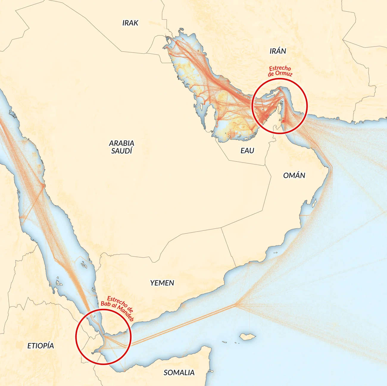 La amenaza iraní de cerrar el Estrecho de Ormuz —ruta por la que transita el 20% del GNL mundial, principalmente hacia Asia— alertó a inversores y gobiernos. El cierre afectaría especialmente a países como China, India, Japón y Corea del Sur, que absorben más del 80% del crudo y GNL que pasa por esa vía. Créditos: El Órden Mundial.
