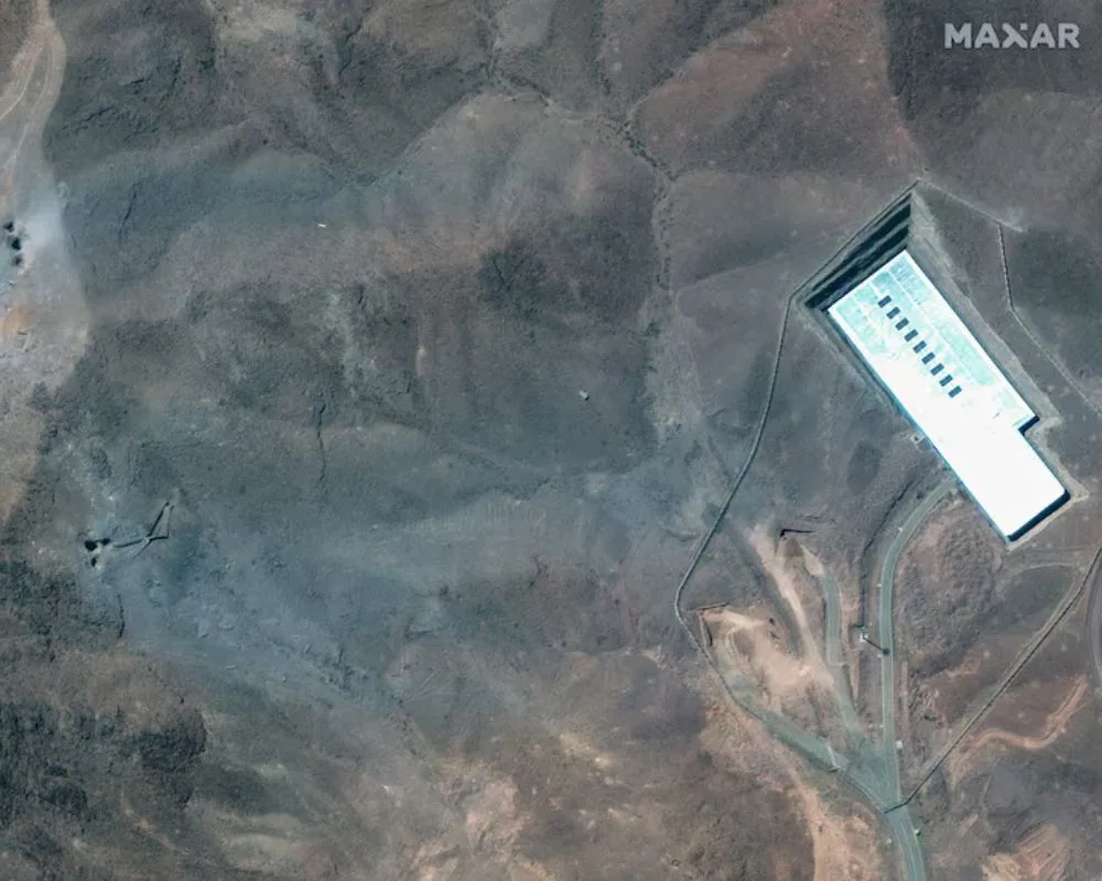 Foto satelital cercana de la cresta del complejo subterráneo de Fordow, tras el ataque estadounidense a la instalación nuclear, 22 de junio de 2025. Créditos: Maxar Technologies/Reuters