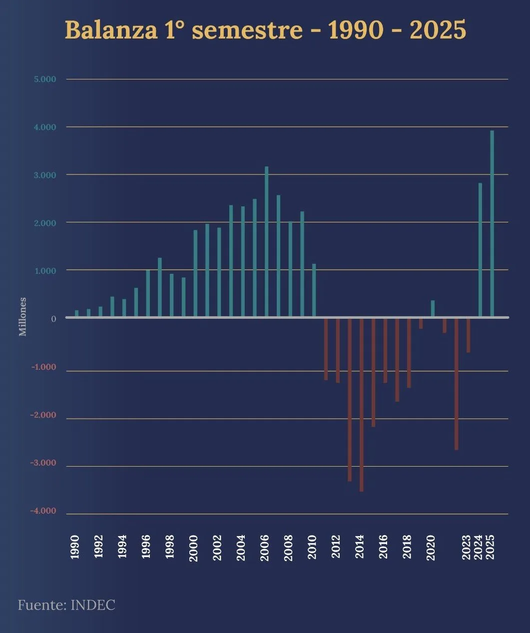 La comparación histórica, que abarca desde 1990, revela que solo en doce semestres la balanza energética fue deficitaria, concentrados entre 2011 y 2019, y luego entre 2021 y 2023.