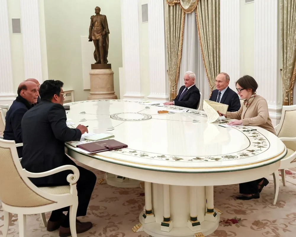 Autoridades, incluido el presidente de Rusia, Vladimir Putin, el ministro de Defensa Andrei Belousov y el ministro de Defensa de India, Rajnath Singh, asisten a una reunión en Moscú, Rusia, el 10 de diciembre de 2024. Créditos: Sputnik/Sofya Sandurskaya/Reuters