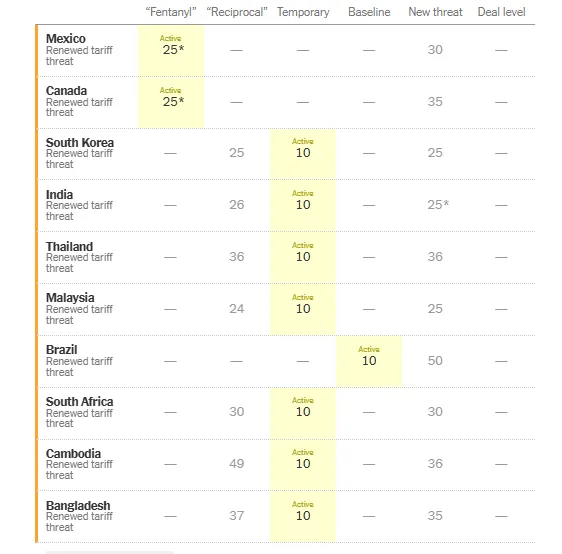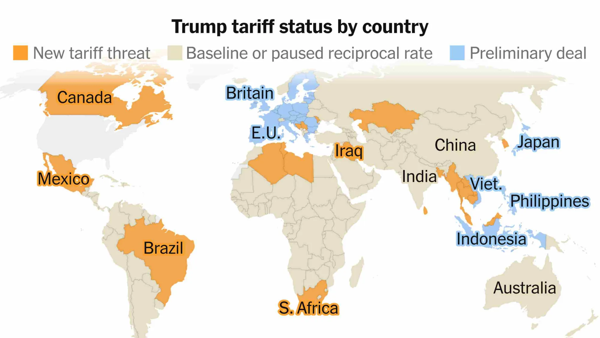Según informó la Casa Blanca, alrededor de dos docenas de países han sido notificados formalmente y deberán pagar nuevos aranceles si no alcanzan acuerdos de último momento. Entre los más afectados se encuentran Brasil, con un arancel del 50%, Tailandia con el 36%, y Corea del Sur con el 25%.