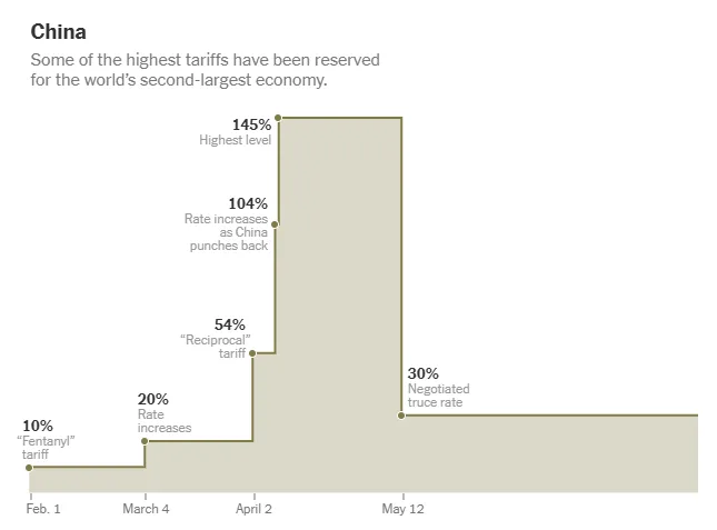 China sigue siendo el principal blanco de la política comercial estadounidense. En mayo, se acordó un arancel base del 30% sobre las importaciones chinas, lo que desescaló temporalmente la tensión bilateral.
