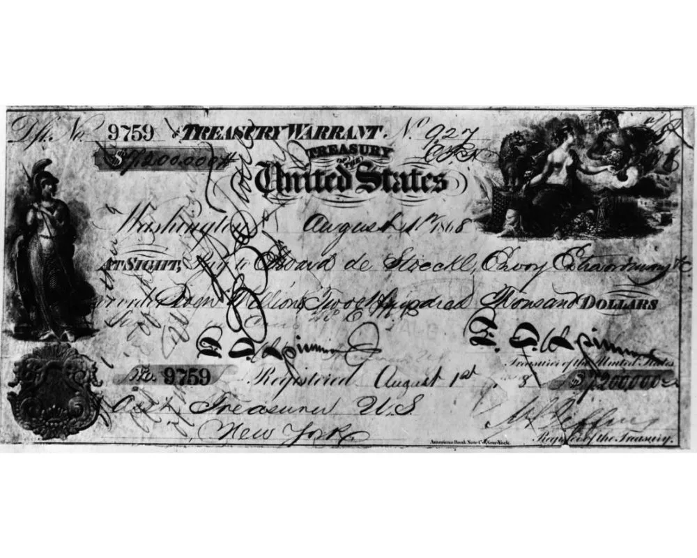 El cheque, emitido por 7.200.000 dólares, con el que EE.UU. compró Alaska a Rusia. Créditos: Three Lions/Hulton Archive/Getty