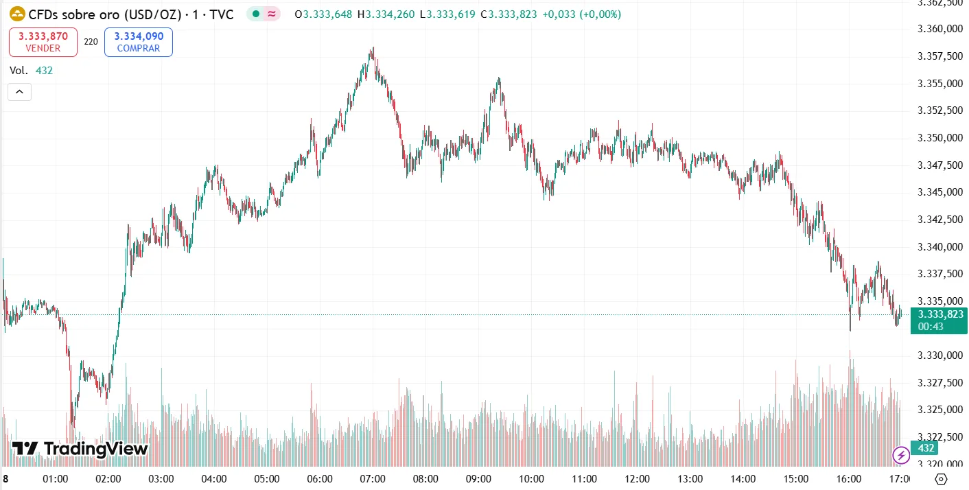 El oro cotizaba en 3.335,21 dólares la onza en la mañana de Argentina, mientras que el dólar se mantenía con mínimas volatilidades en el índice DXY.