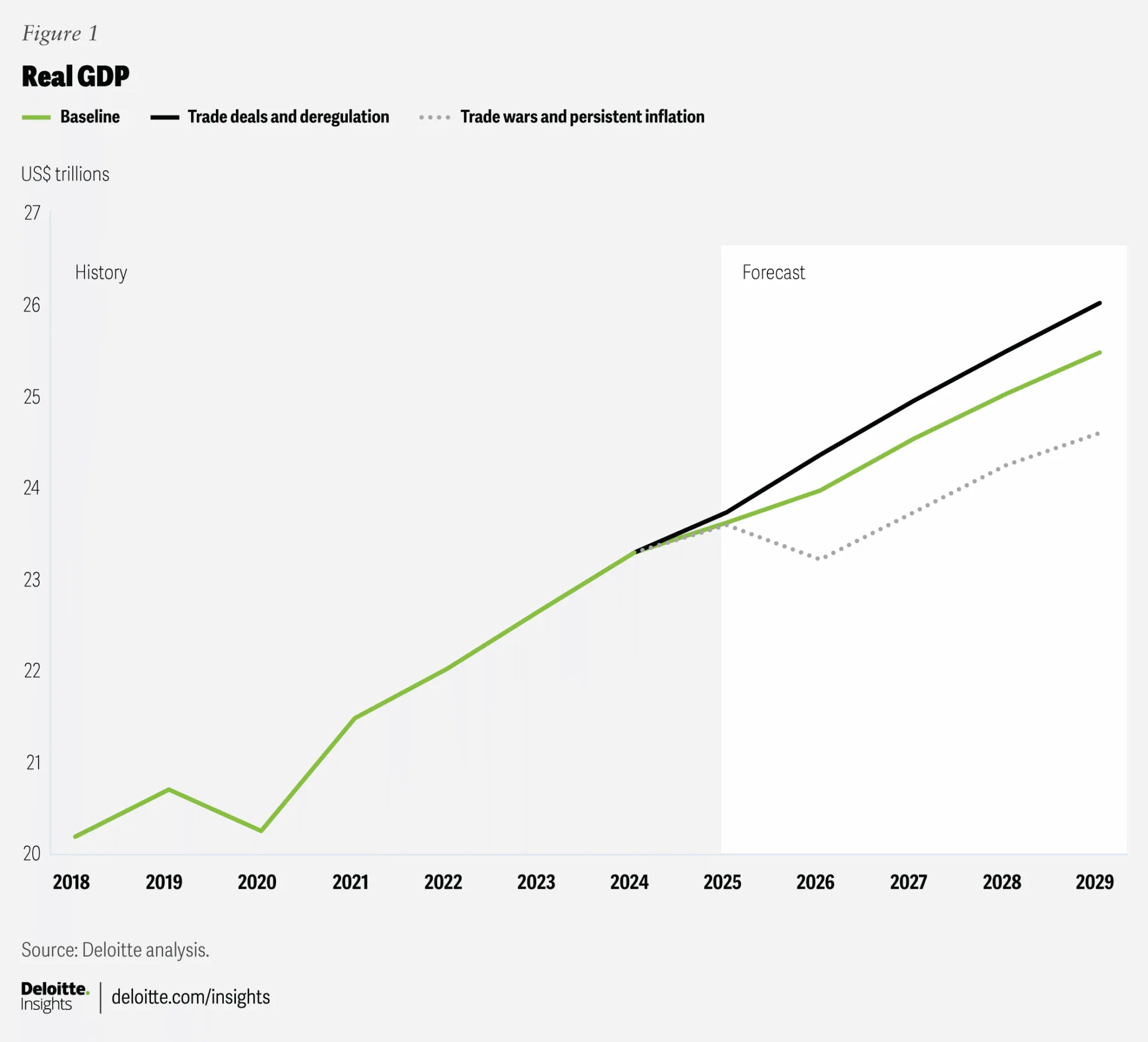 El banco también señala que la política económica de Estados Unidos podría girar hacia un enfoque más expansivo en los próximos dos años, en un contexto marcado por las elecciones de medio término. Créditos: Deloitte.
