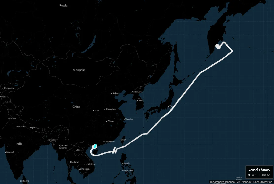 El petrolero Arctic Mulan se convirtió en el primero en atracar en una terminal china con un cargamento de gas natural licuado (GNL) procedente de la planta Arctic LNG 2, sancionada por Estados Unidos. La descarga se realizó en la terminal de Beihai, según datos de seguimiento marítimo recopilados por Bloomberg.
