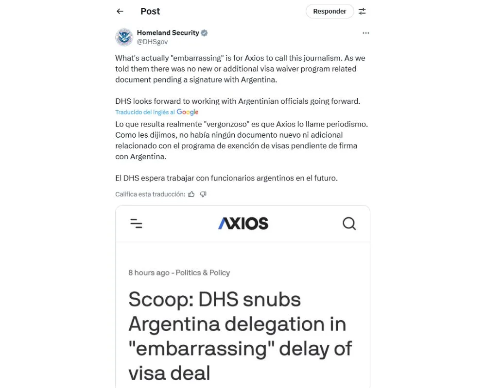 A través de un comunicado, el DHS señaló que “no hay ningún documento nuevo ni adicional pendiente de firma relacionado con el programa de exención de visas”. También calificó de “vergonzosa” la aserción de Axios por presentar información inexacta. Las autoridades estadounidenses enfatizaron que la relación bilateral con Argentina sigue siendo prioritaria y que el trabajo conjunto continuará de manera normal. Además, remarcaron que esperan avanzar en las negociaciones para facilitar el ingreso de ciudadanos argentinos al programa que permite viajar a Estados Unidos por hasta 90 días sin necesidad de visa