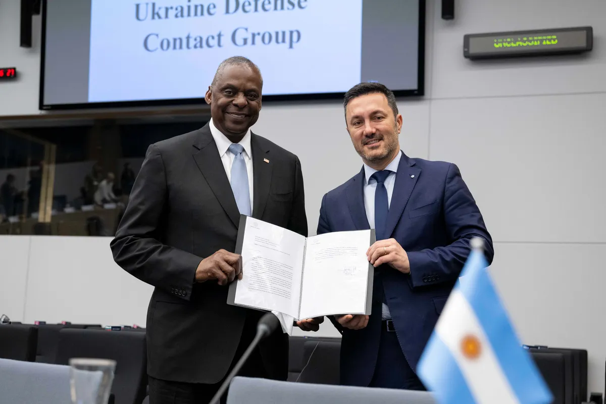 Argentina fue presentada oficialmente como miembro del Grupo en junio de 2024, cuando el secretario de Defensa de EE.UU., Lloyd Austin, anunció la incorporación de varios países socios, entre ellos Buenos Aires. En esa primera participación, el entonces ministro de Defensa argentino Luis Petri viajó a Bruselas en un gesto que buscó mostrar un mayor alineamiento con Ucrania.