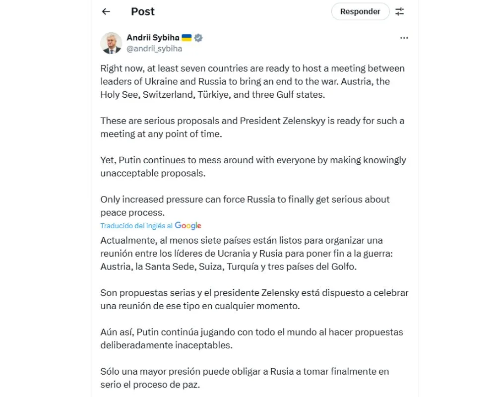 La respuesta de Kiev llegó rápidamente a través del ministro de Exteriores, Andríi Sybiha, quien calificó la propuesta de “inaceptable” y recordó que al menos siete países (incluyendo Austria, Suiza, Turquía, la Santa Sede y tres estados del Golfo) se han ofrecido a organizar la reunión en un terreno neutral. Sybiha recalcó que el presidente Zelenski está dispuesto a dialogar en cualquier momento y lugar, siempre que se garantice un espacio seguro y equilibrado para ambas partes.