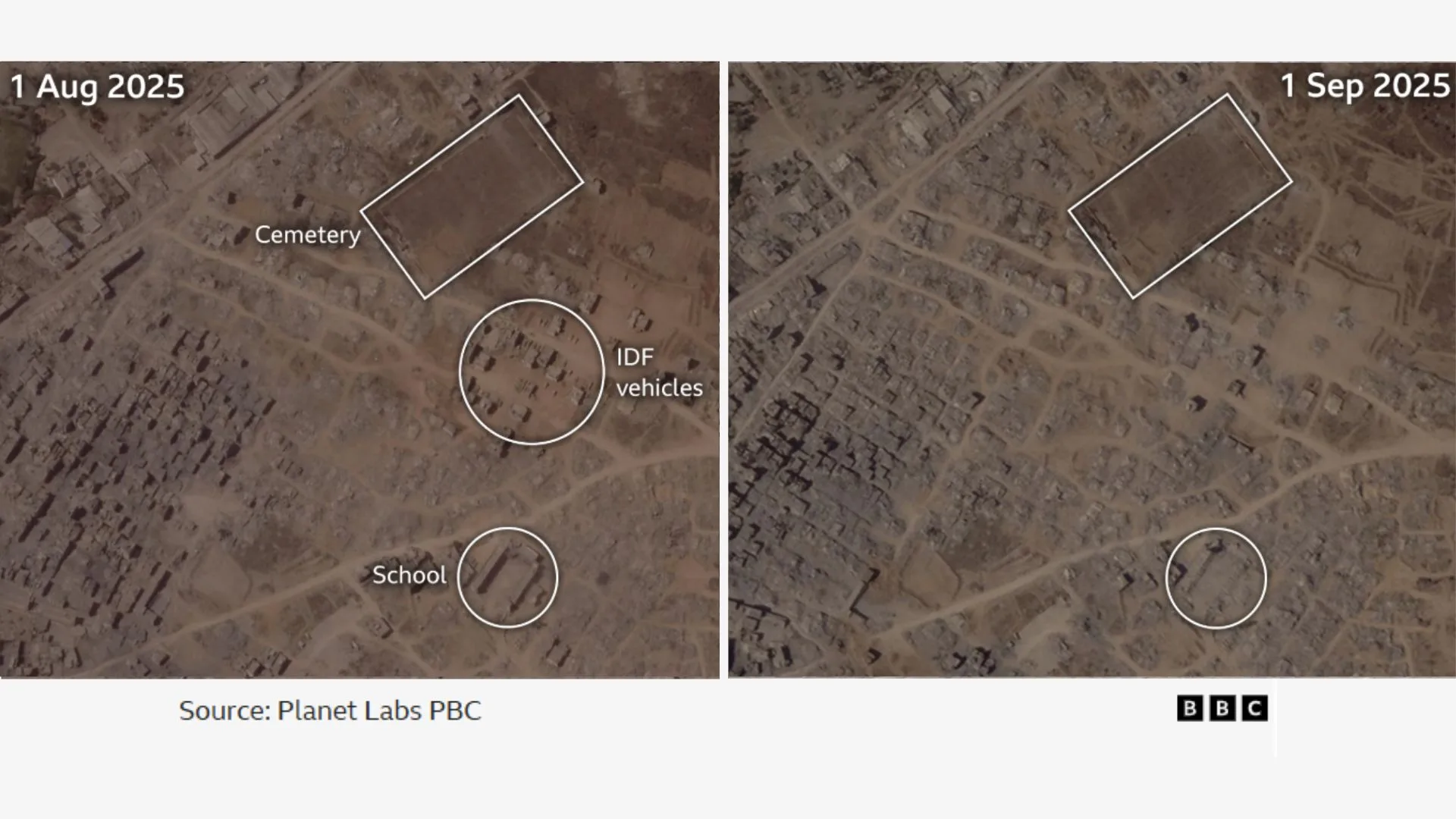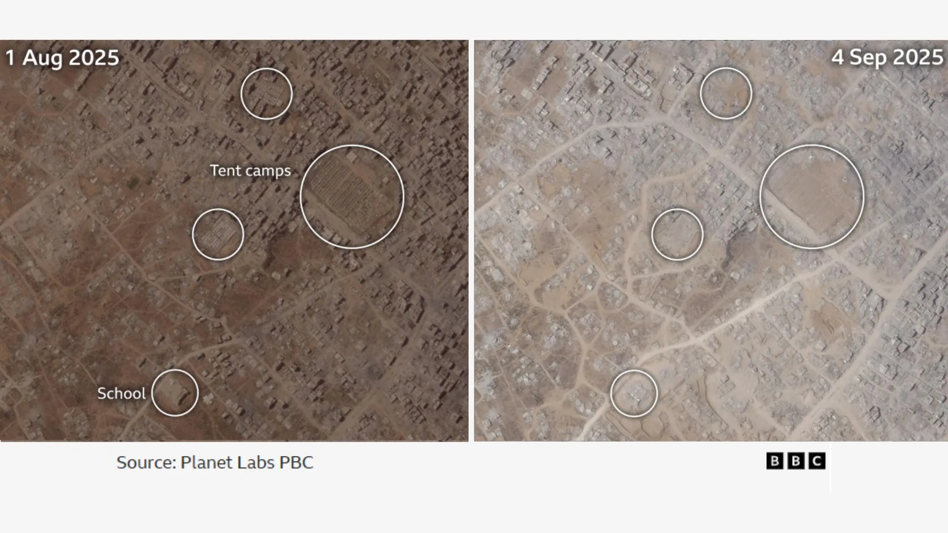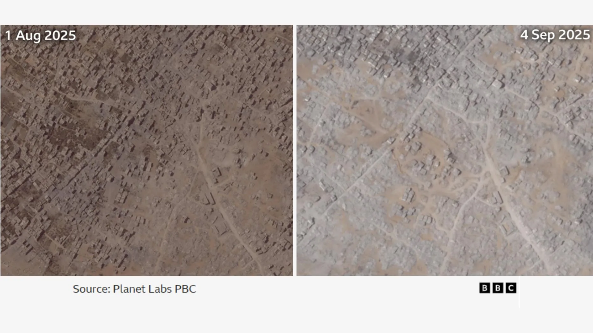 Las imágenes por satélite muestran que ya se han producido daños significativos en los barrios de Sheikh Radwan, Zeitoun y Tuffah de la ciudad de Gaza en las últimas semanas, donde decenas de edificios de la ciudad fueron arrasados entre agosto y septiembre. Mientras tanto, las FDI confirman haber tomado el control de casi la mitad de la ciudad de Gaza e impulsan una nueva ofensiva a gran escala.