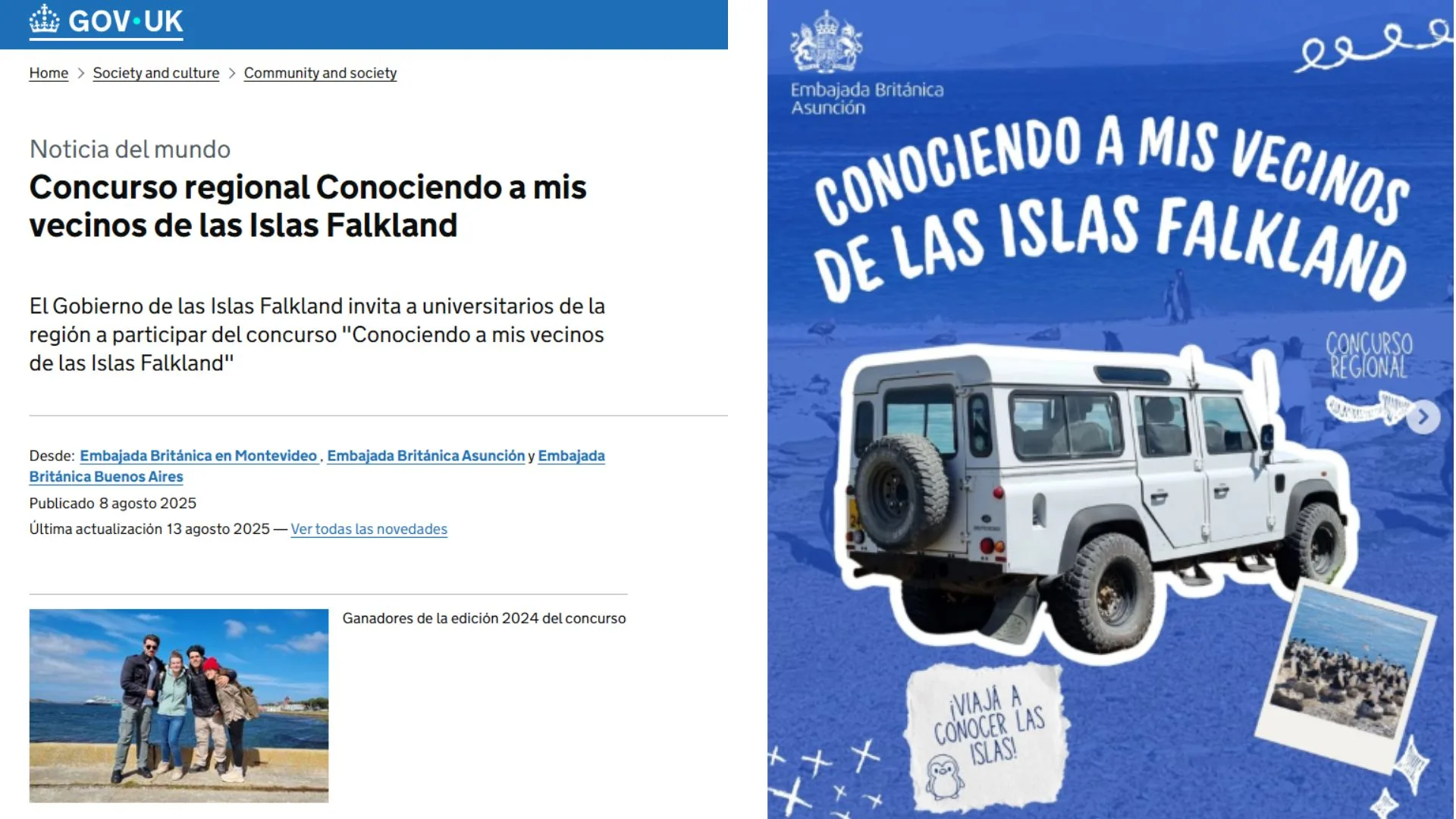 El concurso, promovido por el autodenominado “Gobierno de las Islas Malvinas”, invitaba a jóvenes universitarios a visitar las islas con todos los gastos cubiertos. La consigna consistía en explicar en inglés por qué desean “conocer a sus vecinos de las Malvinas”, instalando, en cierto punto, la idea de que los isleños son parte del entorno regional. Los ganadores también debían ser activos en redes sociales; en cierto punto, accionar como “voceros” del gobierno ilegítimo británico.