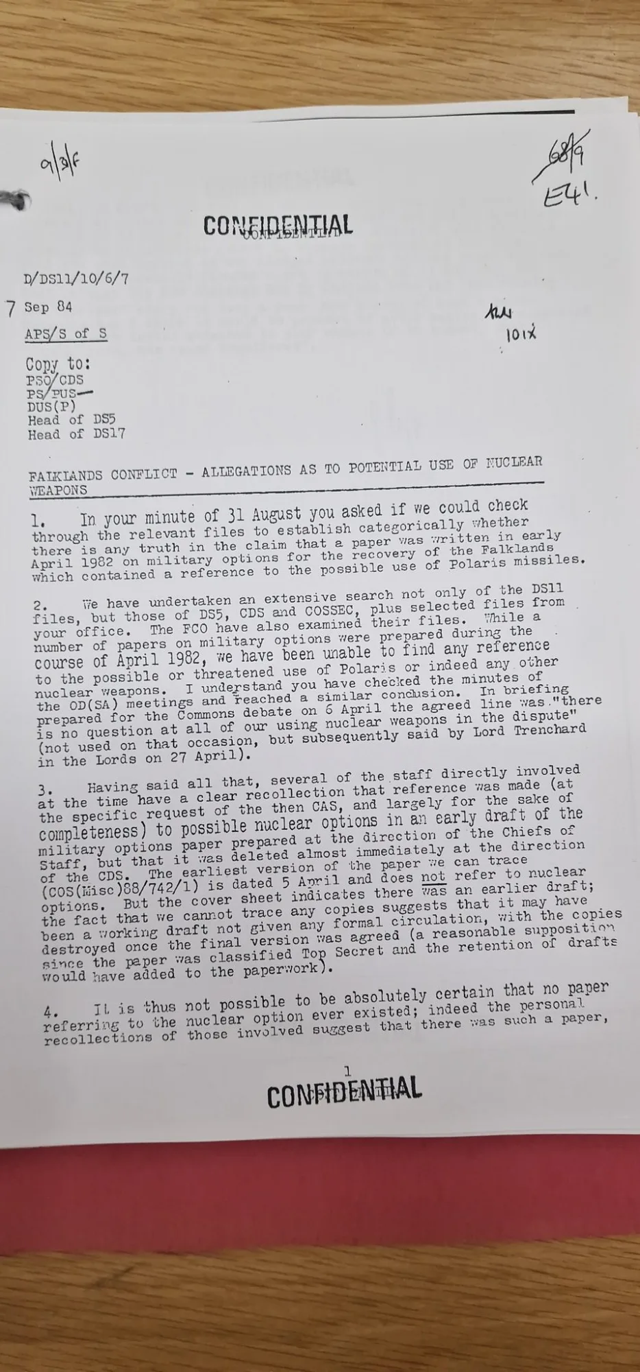 Los documentos fueron expuestos en redes sociales por el analista Sir Humphrey (@pinstripedline), confirmando que el Reino Unido, además de haber trasladado armas nucleares a la zona de operaciones, llegó a considerar —al menos en un borrador de trabajo— escenarios de empleo nuclear. Pero esta no es la primera vez que los archivos oficiales británicos exponen la dimensión nuclear de la guerra, ya que en enero de 2022, Escenario Mundial informó que documentos desclasificados revelaban la presencia de decenas de armas nucleares de profundidad a bordo de buques británicos durante la campaña de 1982.