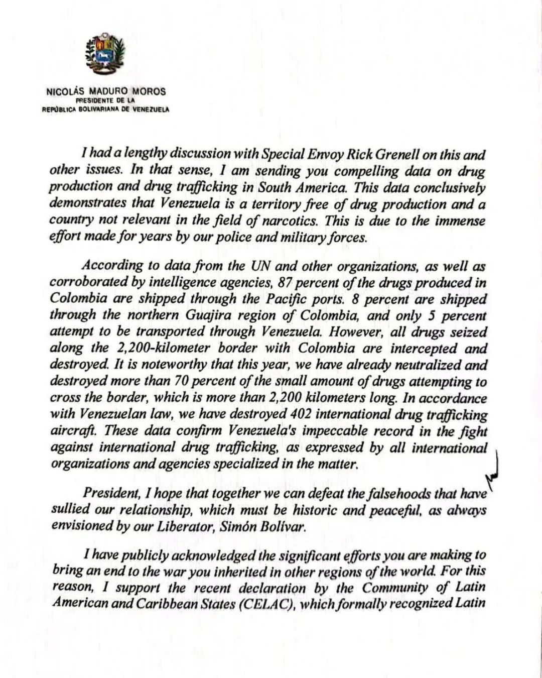 La carta concluye con un llamado a “promover la paz mediante un diálogo constructivo y el entendimiento mutuo en todo el hemisferio”, apelando a la figura histórica de Simón Bolívar como símbolo de unidad continental.