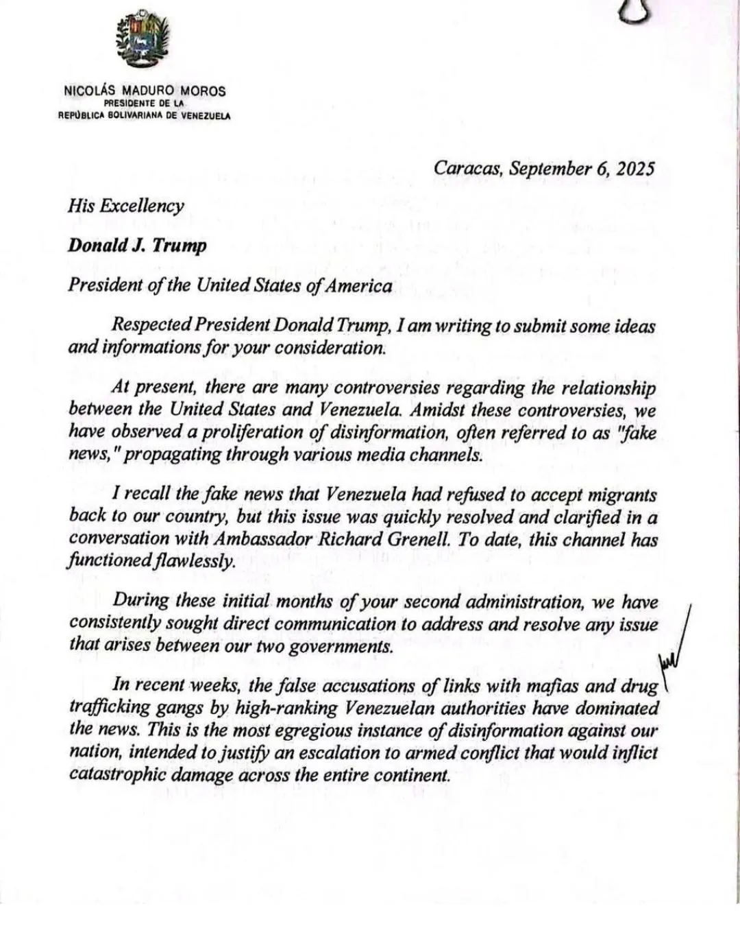En este contexto, la carta de Maduro intenta abrir un espacio de negociación con el enviado especial Richard Grenell, quien ha actuado previamente como mediador en temas de migración y liberación de detenidos. Sin embargo, hasta el momento ni la Casa Blanca ni el entorno de Grenell han confirmado avances en ese sentido.