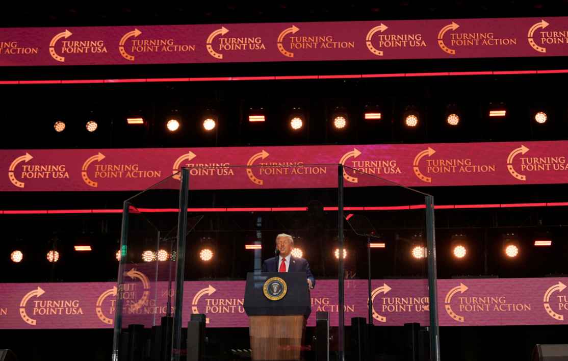 La presencia más disruptiva en el escenario por el funeral de Charlie Kirk -un evento masivo donde hablaron Donald Trump y buena parte de su administración- tal vez fuera la estructura de hierro y cristal antibala que protegía el atril encabezado por el sello presidencial de Estados Unidos.