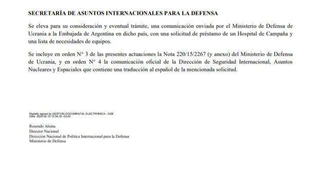El Ministerio de Defensa de Ucrania envió una comunicación oficial a la Embajada de Argentina en Kiev solicitando asistencia militar y logística. La documentación interna del Ministerio de Defensa argentino, fechada el 10 de septiembre de 2025, confirma la recepción de la nota y detalla que el pedido incluye el préstamo de un hospital de campaña, junto con una lista de equipos adicionales requeridos