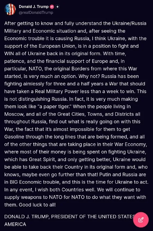 El presidente de Estados Unidos, Donald J. Trump, sostuvo que Ucrania, con apoyo financiero y militar de la Unión Europea y la OTAN, se encuentra en condiciones de recuperar todos sus territorios ocupados desde el inicio de la guerra en 2022. En un extenso mensaje publicado en su cuenta de Truth Social, Trump afirmó que Rusia atraviesa “graves problemas económicos” y que la prolongación del conflicto “solo evidencia que es un tigre de papel”.