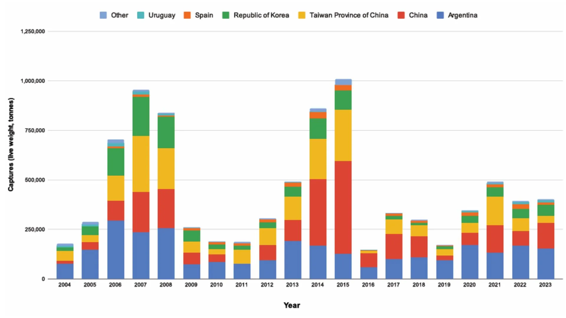 Desembarques de calamar argentino por país declarante (2004-2023). Fuente: FAO Fishstat