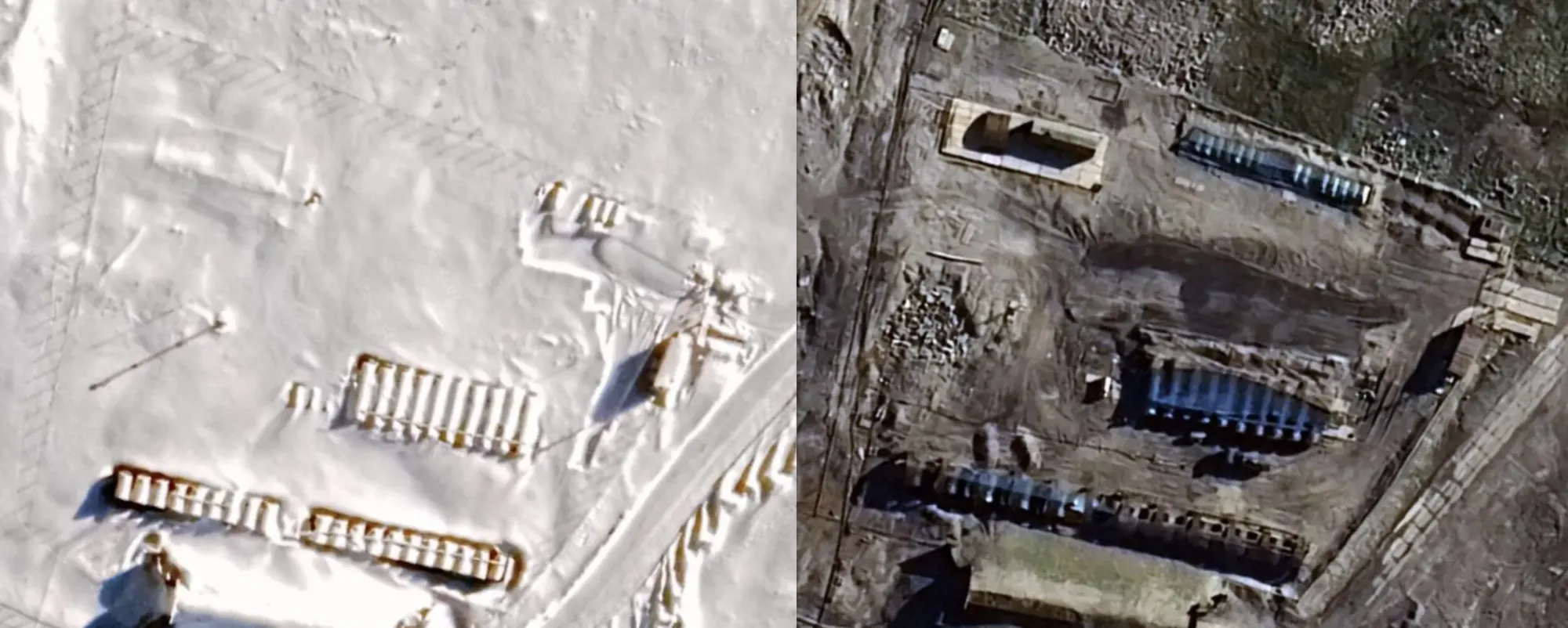 La imagen a la izquierda muestra los tanques de combustible sin cubierta en el invierno de 2021. La imagen de los mismos tanques con redes para drones a la derecha es de mediados de agosto de 2025. Google Earth