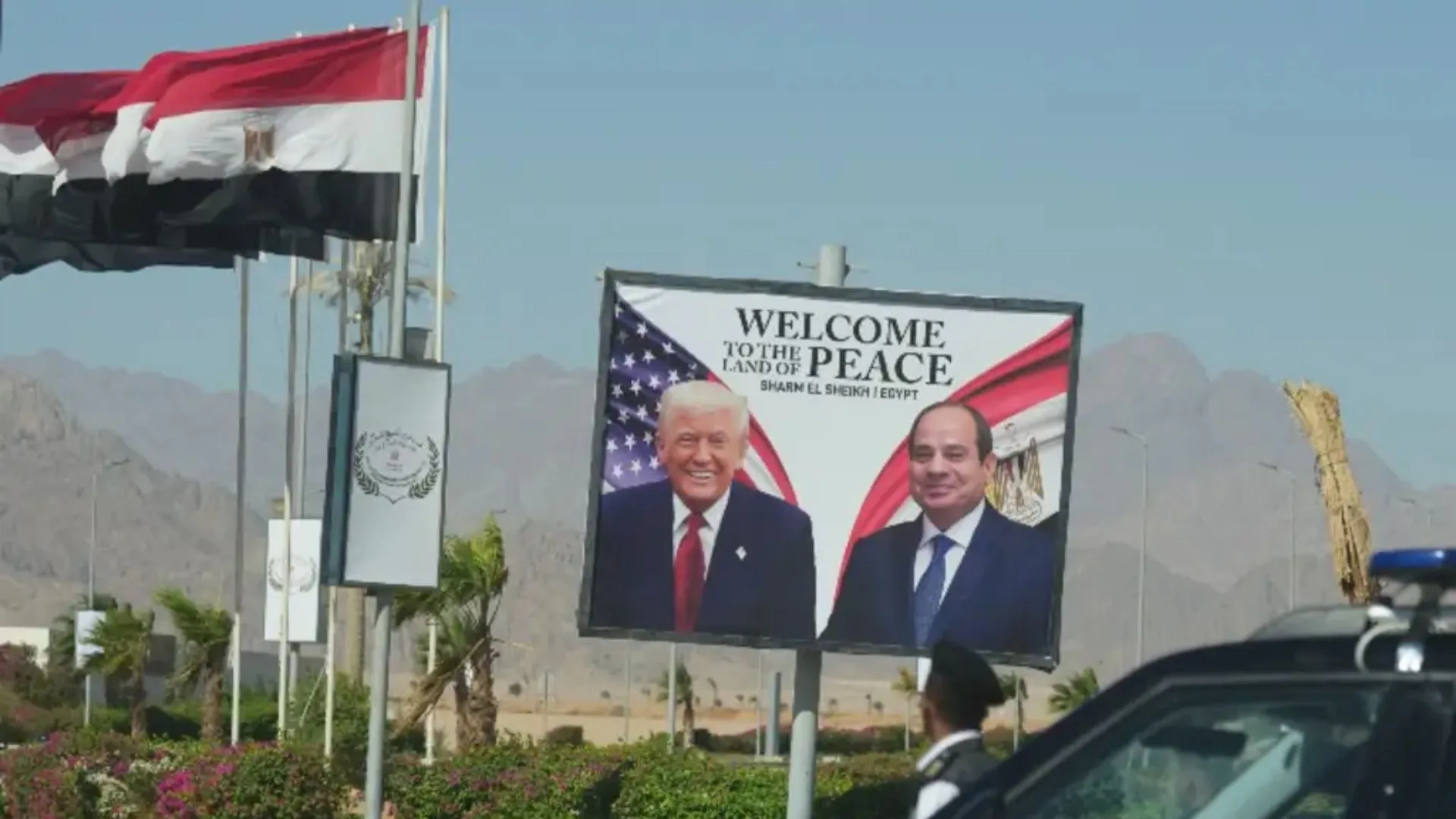 Un vehículo policial delante de un cartel que muestra al presidente egipcio Abdel-Fattah el-Sissi y al presidente estadounidense Donald Trump en la ciudad de Sharm el-Sheikh, en el Mar Rojo, Egipto, el lunes 13 de octubre de 2025. AP Photo/Amr Nabil COMENTARIOS