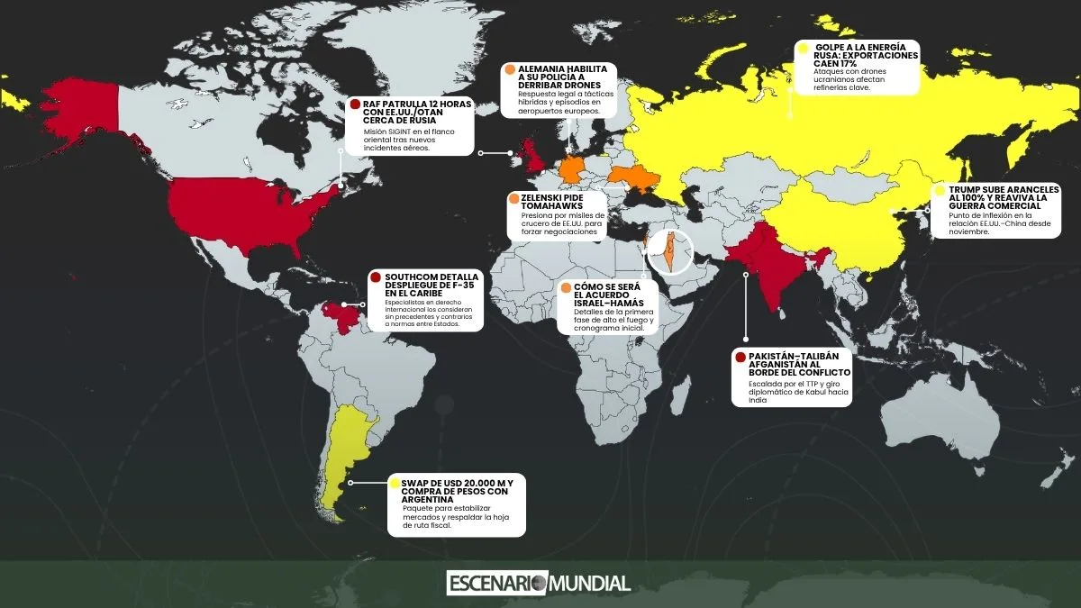 En Asia y América, las tensiones se trasladaron al plano económico y militar. Estados Unidos elevó los aranceles a China al 100 %, reabriendo la guerra comercial y generando repercusiones en los mercados asiáticos, mientras el conflicto entre Pakistán y los talibanes afganos amenaza con transformarse en un enfrentamiento abierto. En el Caribe, el Comando Sur confirmó el despliegue de F-35 en plena fricción con Venezuela, y la Casa Blanca descartó investigar un presunto ataque contra su embajada en Caracas. En paralelo, Argentina cerró un nuevo paquete financiero de 20.000 millones de dólares con el Tesoro estadounidense, en una semana marcada por la convergencia entre poder militar, estrategia política y urgencias económicas.