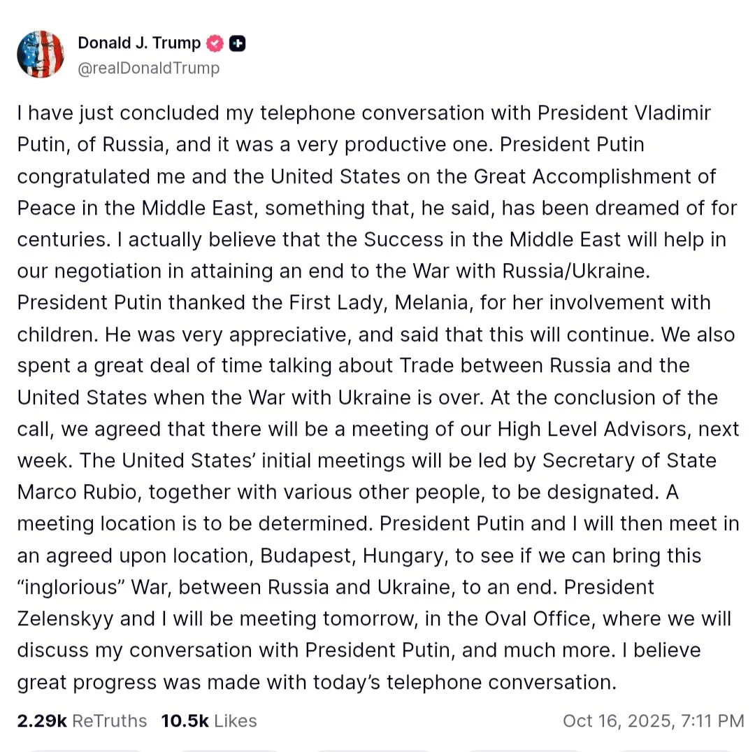 En su mensaje publicado en Truth Social, Trump aseguró que Putin felicitó a Estados Unidos por el acuerdo de paz en Medio Oriente, calificándolo como un “gran logro histórico” que podría servir de base para una futura resolución del conflicto europeo.