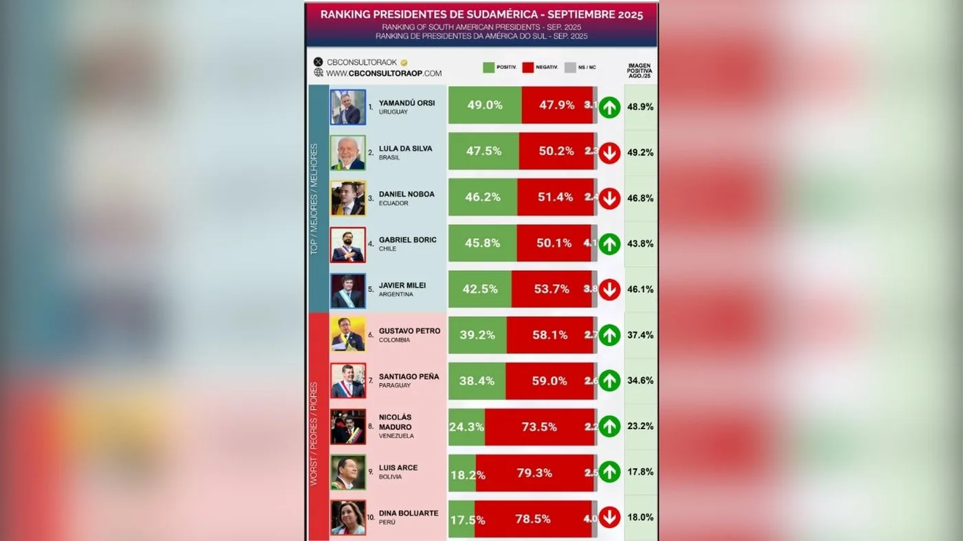 En una tabla de 10 posiciones, el mandatario boliviano, Luis Arce, se encuentra noveno, con el 79,3% de imagen negativa y apenas con un 18% positiva. Este fue el último relevamiento de fines de septiembre de CB Consultora.