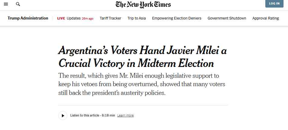 Los resultados fueron calificados como una “una victoria enfática para Milei” que refuerza su mandato: “Su partido recibió cerca del 40 por ciento de los votos, lo que muestra que, a pesar del dolor infligido por sus medidas de austeridad, muchos argentinos siguen dispuestos a respaldar su experimento libertario”. Sin embargo, el artículo también destaca la baja concurrencia de votantes, al señalar correctamente que el domingo 26 arrojó “la participación más baja en una elección nacional desde el retorno de la democracia en 1983”.