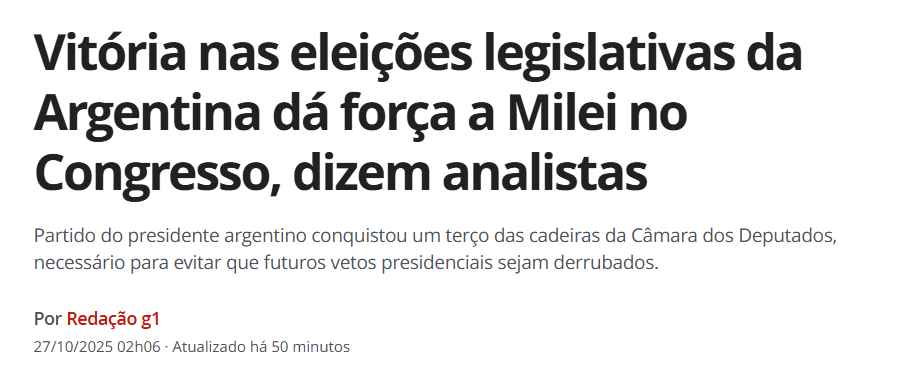 Los medios regionales también se hicieron eco de la victoria y profundizaron en sus repercusiones futuras. En Brasil, el portal G1 de la cadena Globo consideró, en base a analistas, que la “victoria en las elecciones legislativas de Argentina da fuerza a Milei en el Congreso”.