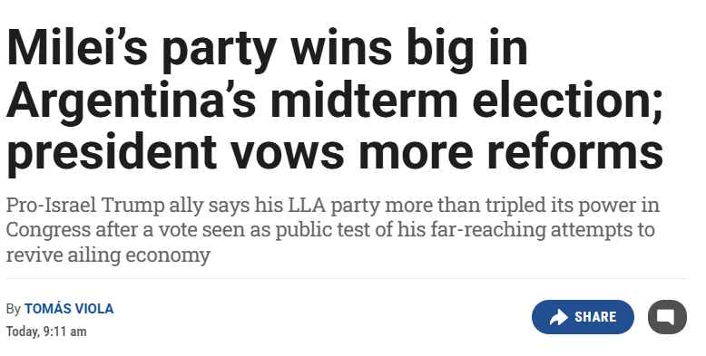 En Israel, la otra nación a la que Milei prometió alianza incondicional, su triunfo también fue seguido por la prensa local. “El partido de Milei tiene una gran victoria en las legislativas de Argentina; el presidente promete más reformas”, titula el Times of Israel en un artículo firmado por Tomás Viola.