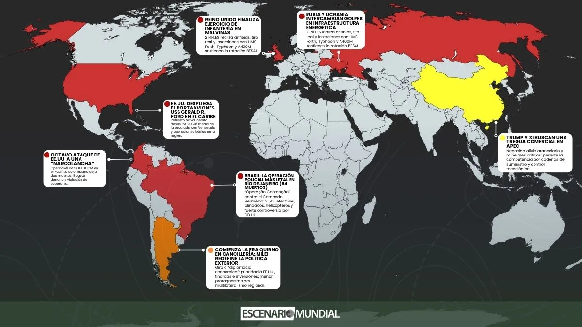 América Latina también fue escenario de poder. Estados Unidos desplegó el portaaviones USS Gerald R. Ford en el Caribe y ejecutó un nuevo ataque naval contra una “narcolancha” en Colombia, lo que elevó las tensiones con Bogotá. En paralelo, Lula da Silva y Donald Trump reabrieron el diálogo bilateral con foco en energía y tierras raras, y Brasil vivió la operación policial más letal de su historia reciente en Río de Janeiro.