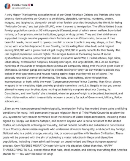 El mensaje presidencial, que comenzó como un saludo por el Día de Acción de Gracias, dio pie a la valoración que el mandatario hace de los extranjeros que viven en Estados Unidos: “La población extranjera oficial en Estados Unidos es de 53 millones de personas (censo), la mayor parte de los cuales están en la Seguridad Social, de países fallidos, de prisiones, instituciones mentales, pandillas o carteles de drogas”.