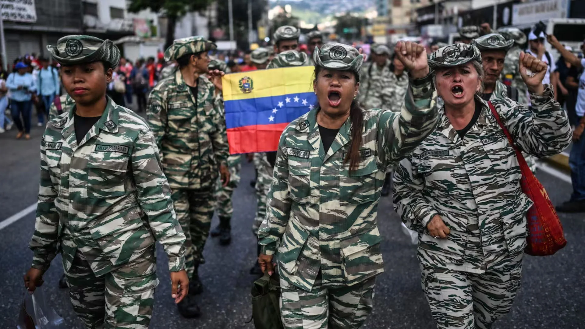 Miembros de la milicia bolivariana se manifiestan frente a la sede de las Naciones Unidas en Caracas, Venezuela, el 6 de octubre. (Juan Barreto/AFP/Getty Images)