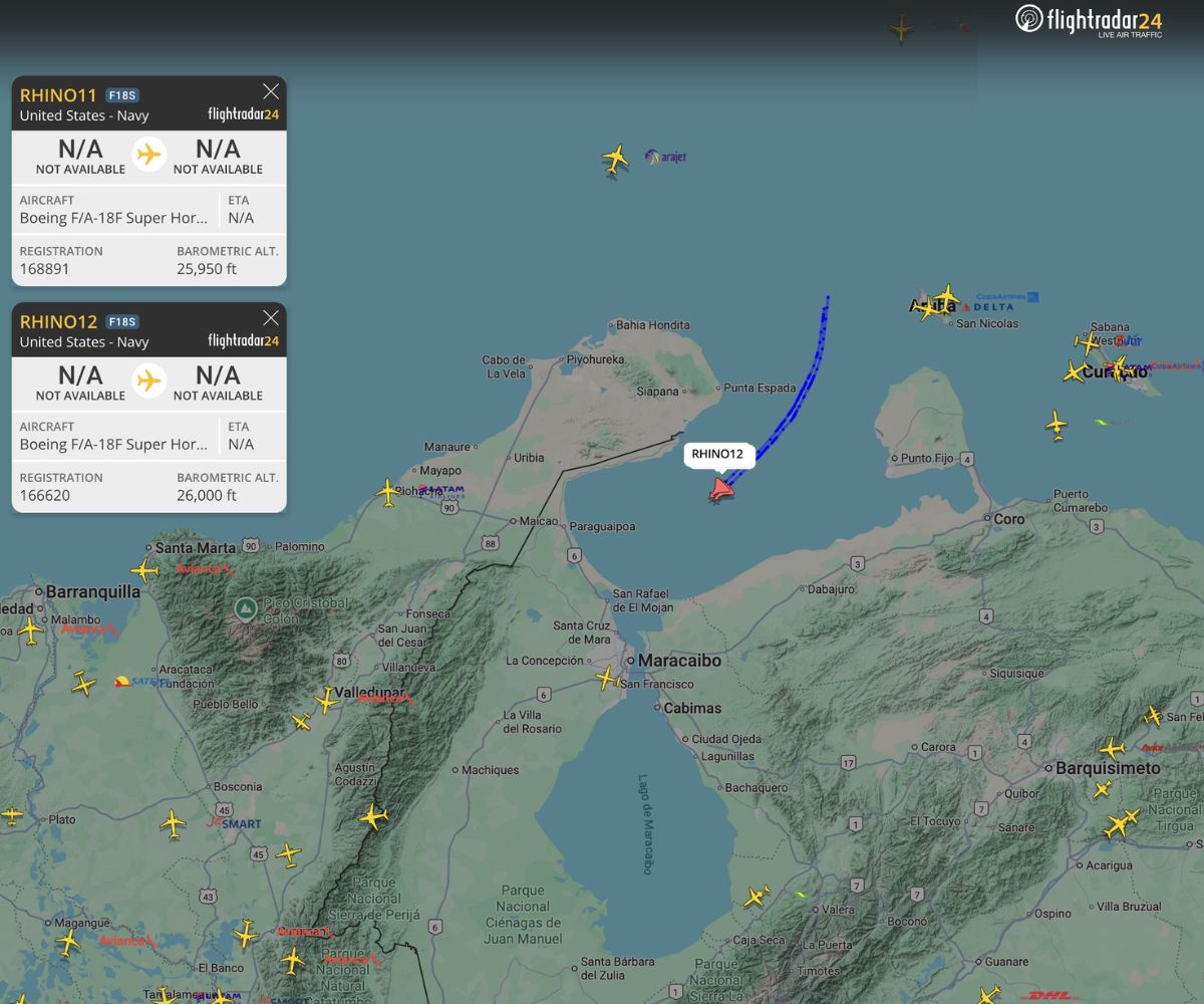 El sobrevuelo de dos F/A-18 Super Hornet sobre el Golfo de Venezuela, trazando órbitas sobre aguas frente a Zulia y la península de Paraguaná, es hasta ahora la señal operativa más cercana al territorio venezolano dentro del actual ciclo de presión militar estadounidense en el Caribe. Según los registros de plataformas de seguimiento como Flightradar24, las aeronaves ingresaron al golfo y permanecieron varios minutos ejecutando maniobras circulares en las proximidades del Lago de Maracaibo y de la base naval Rafael Urdaneta, el principal nodo naval del país en el occidente.