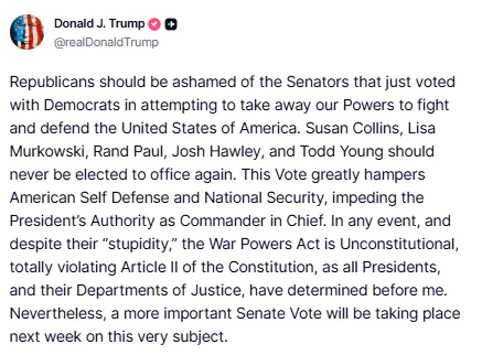 La votación mostró un quiebre dentro del Partido Republicano. Algunos senadores se alinearon con los demócratas para avanzar en la resolución de poderes de guerra. Aunque el texto aún debe superar la Cámara de Representantes —dominada por republicanos— y un eventual veto presidencial, el gesto marca un raro desafío institucional al Ejecutivo. Trump reaccionó con dureza en redes sociales, acusando a los senadores republicanos que apoyaron la medida de “intentar quitarle poderes para defender a Estados Unidos”.
