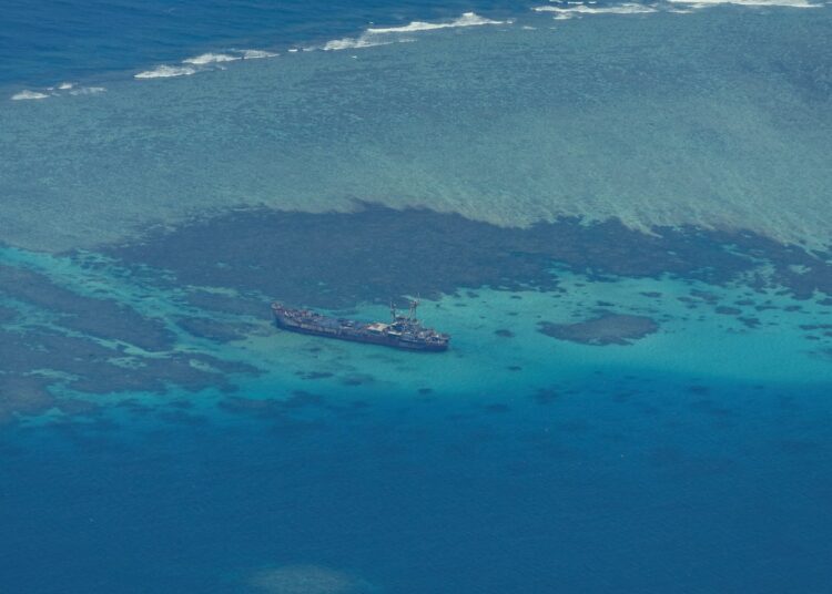 Una bandera filipina ondea en un barco deteriorado de la Armada filipina que lleva encallado desde 1999 y se convirtió en un destacamento militar filipino en el disputado Segundo Banco Thomas, parte de las islas Spratly, en el mar de la China Meridional. Crédito: Reuters